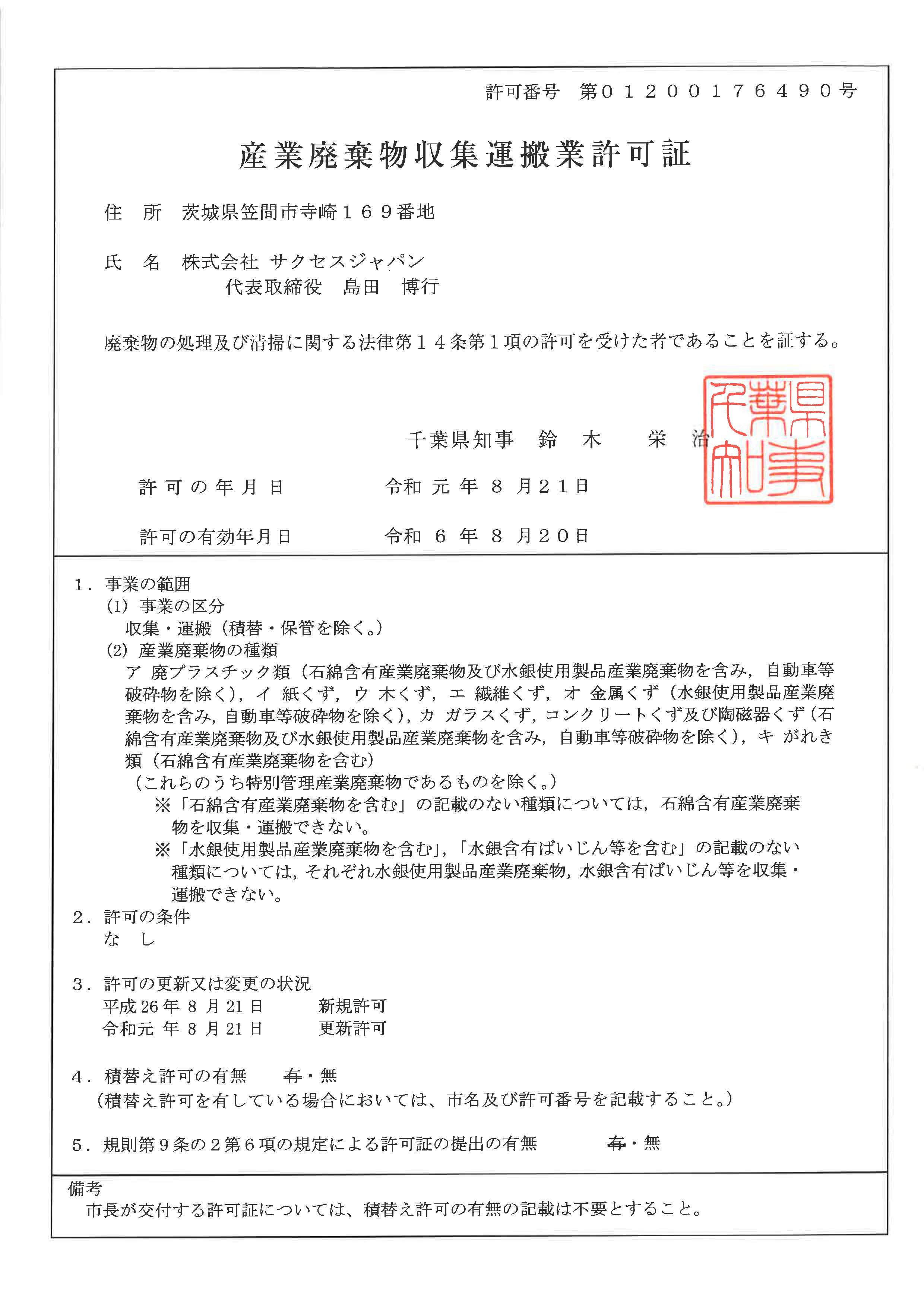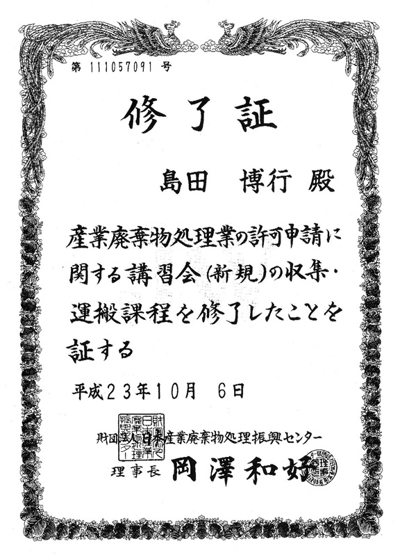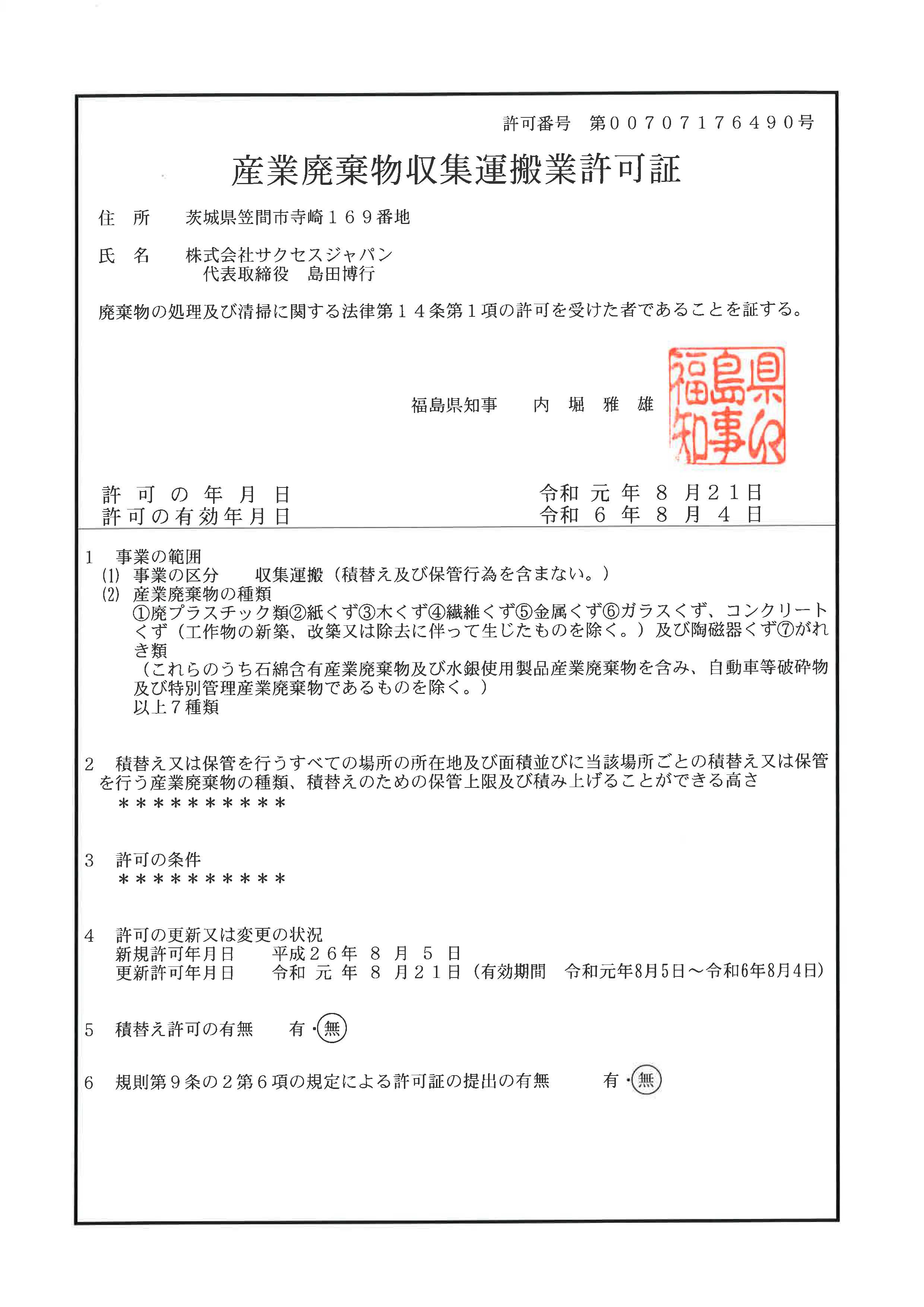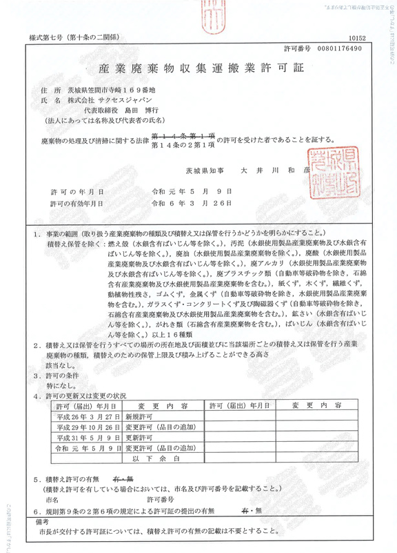 産業廃棄物収集運搬業許可証